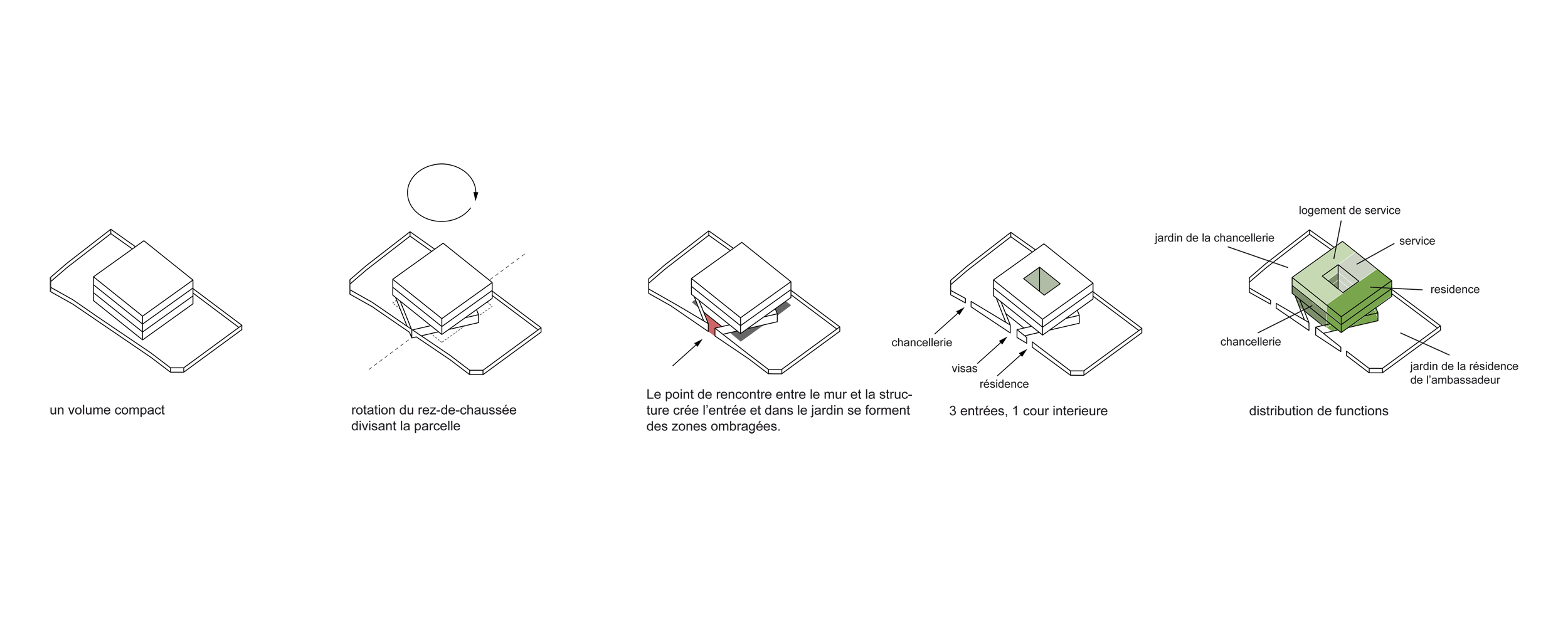 Afin de créer une situation spatiale et fonctionnelle convaincante, le rez-de-chaussée tourne sur lui-même au sein du volume de construction. Cette rotation permet de chercher la connexion avec le mur d’enceinte et la rue et de sous-diviser l’espace extérieur en deux parties : l’accès représentatif à la résidence de l’ambassadeur au sud et l’accès à la chancellerie au nord.